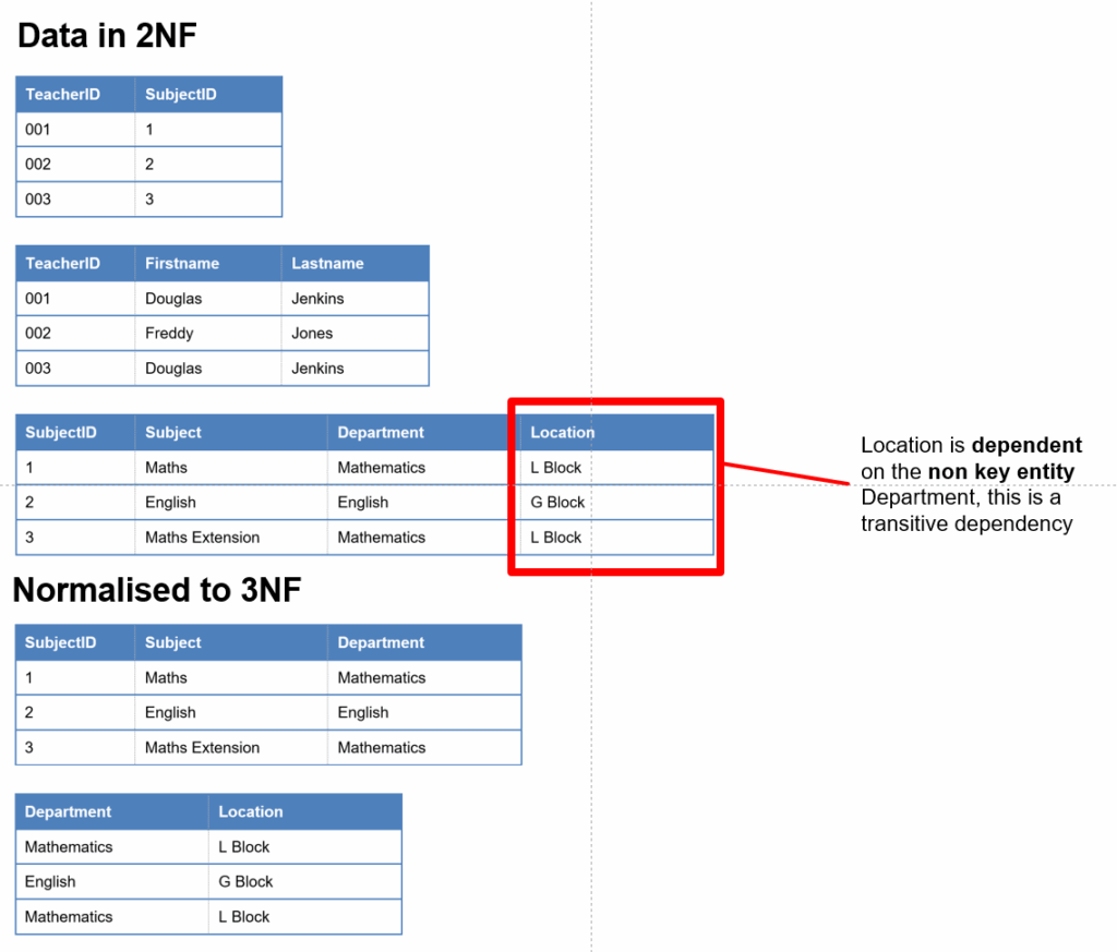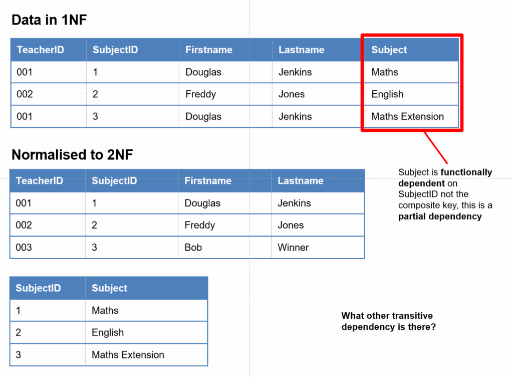 There must be no partial dependencies. Attributes must be functionaly dependent on the whole primary key. This means if there is a composite key no attribute can be dependent on only one of the attributes making the composite key. Below the composite primary key to the table is TeacherID and SubjectID.