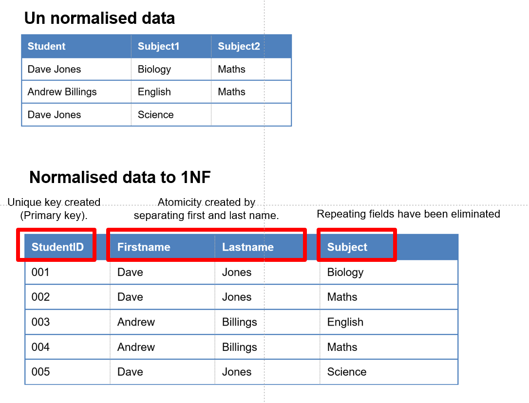 Each field/attribute must contain an atomic value within its domain. This means a field with first name and last name should be split into their atomic values FirstName, and LastName, or a full address should be split into Street, City, and Postcode. This can create additional redundancy in the data, however, 2NF resolves this.