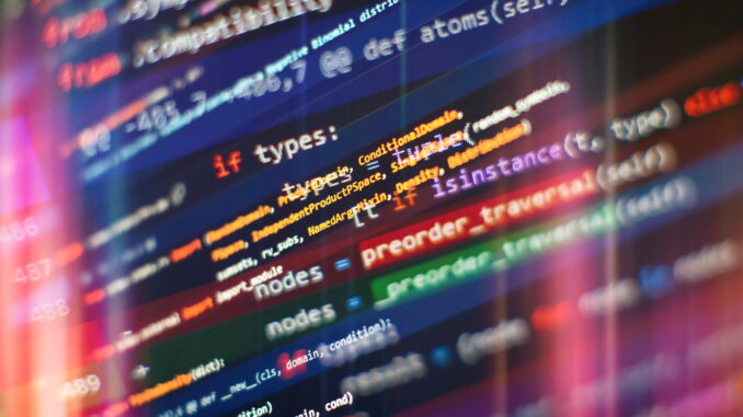 SEO optimization. Modern tech. PHP syntax highlighted. Writing programming functions on laptop. Big data and Internet of things trend.