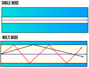 Multi-mode fiber optic has a wider core which allows multiple frequencies of light transmitted simultaneously (hence multi).   As there are more signals transmitted at once multi-mode is faster than single-mode, but has higher attenuation therefore works over shorter distances (2km max).